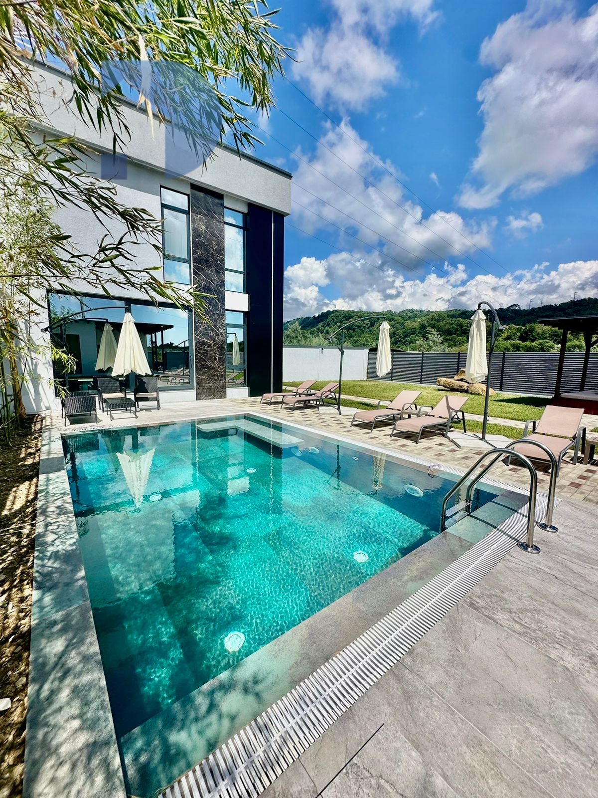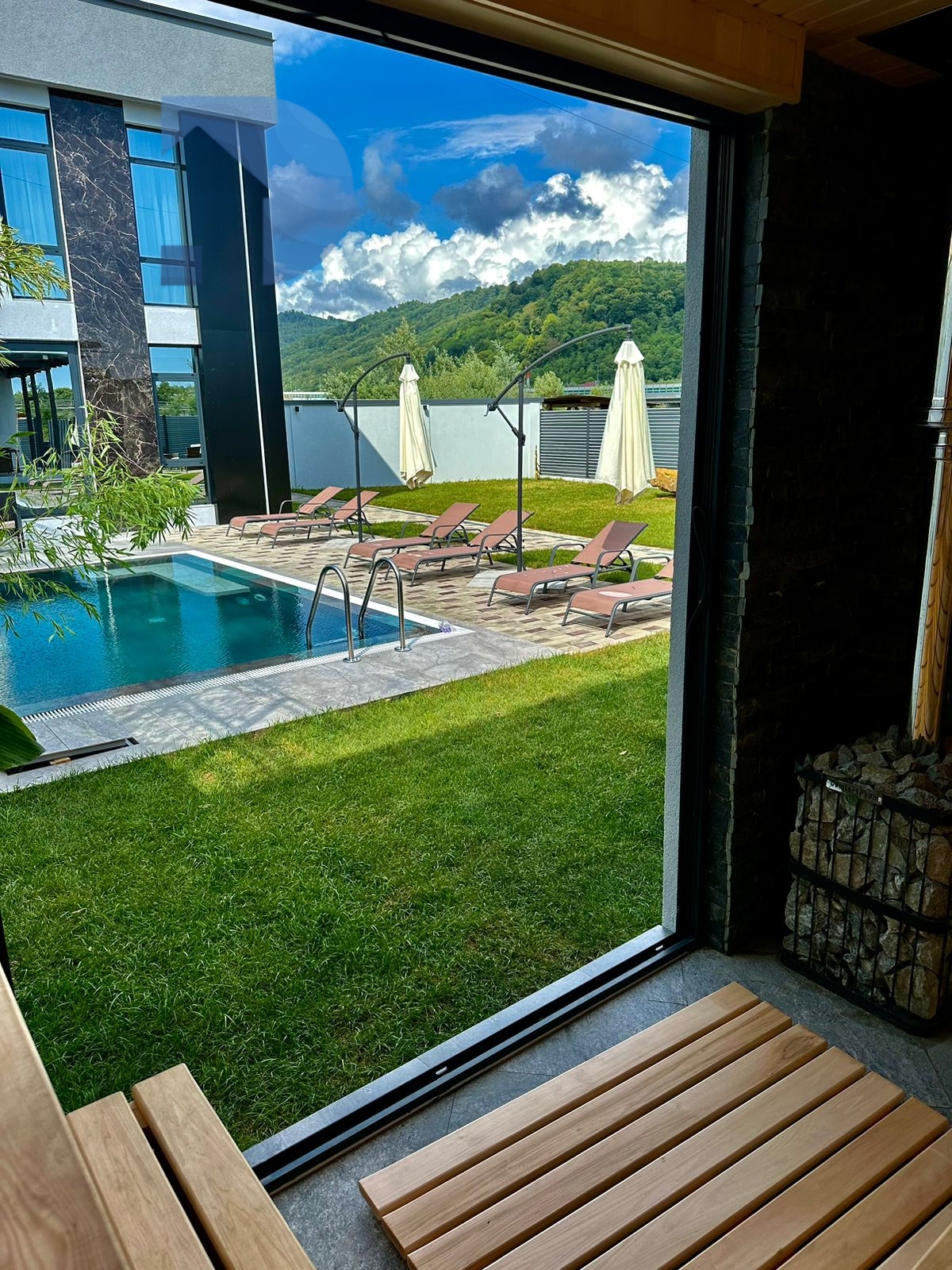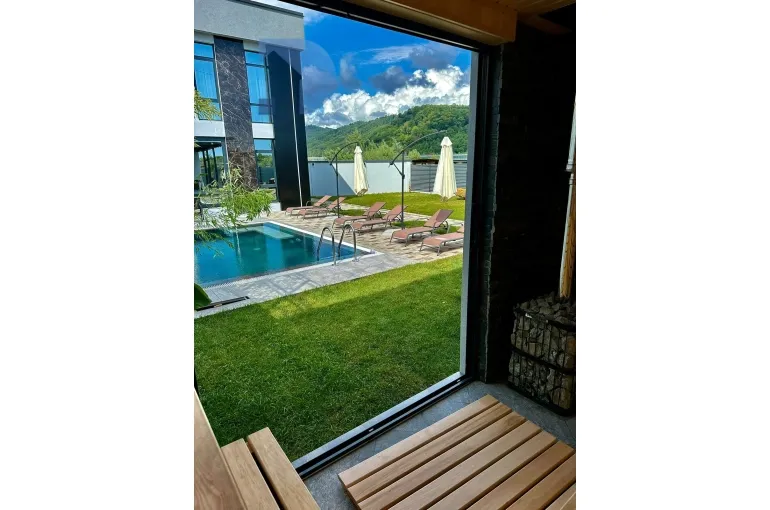 Бассейн, баня на дровах, зона отдыха.